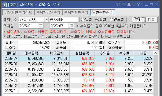 2025년 1월부터 ~ 7월 월별 실현손익입니다.