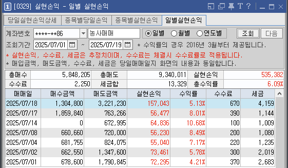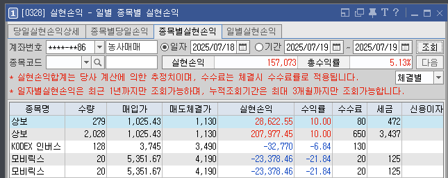 7월 18일 3분할 매수를 한 상보 10% 수익실현과 손실중인 2종목 상계처리로 일별실현손익 157,043원을 수익실현 하였습니다.